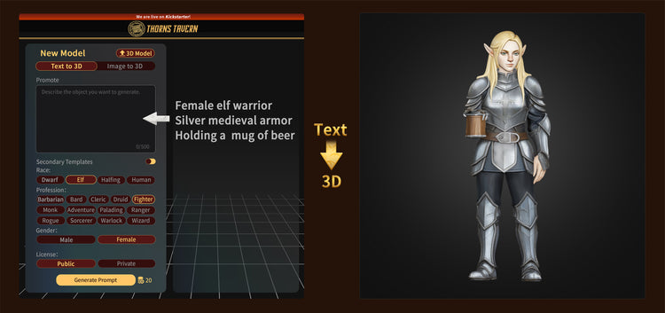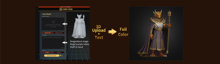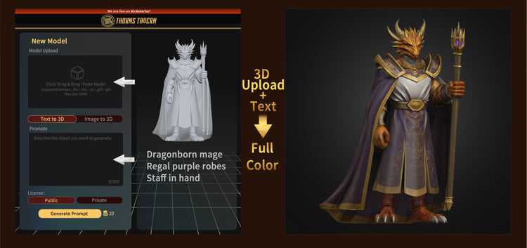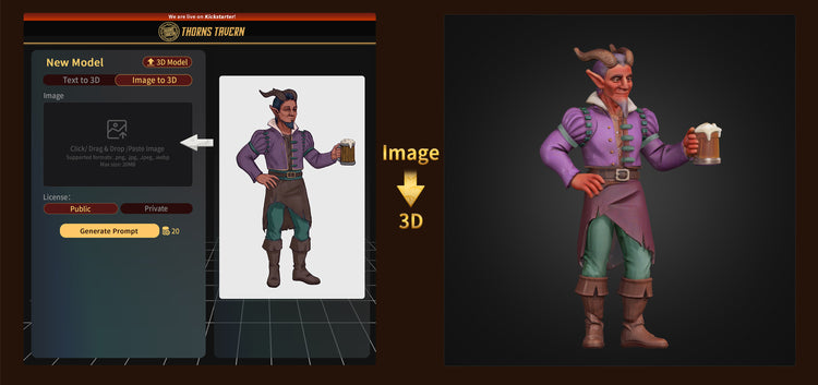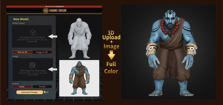 You own the full rights to the models you generate. They are free for personal use (printing, display, modification, etc.). For commercial use, please contact the Thorns Tavern team for authorization and support.We also respect third-party IP rights. Please avoid uploading or generating content that includes: