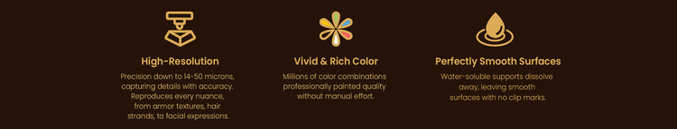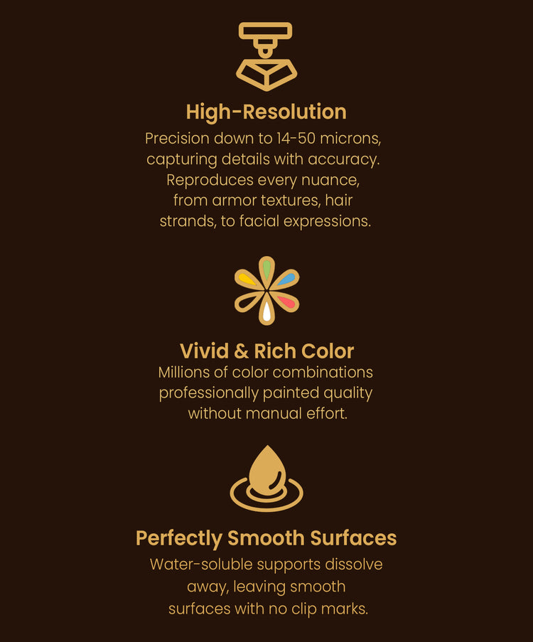 Advanced full-color 3D printing brings your heroes and monsters to life with impressive details. Every miniature combines vibrant colors, precise textures, and lifelike presence, and is ready for combat once they leave the printer without further painting or assembly.